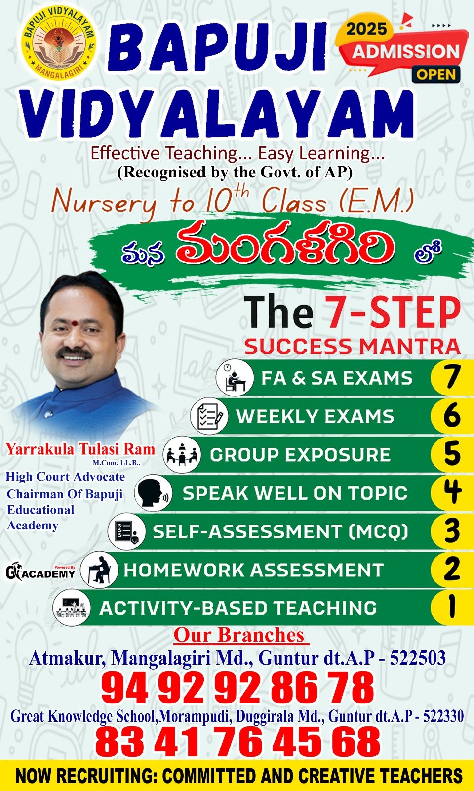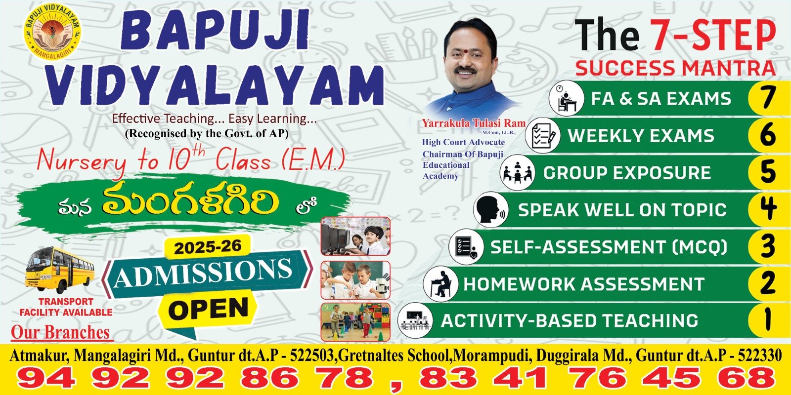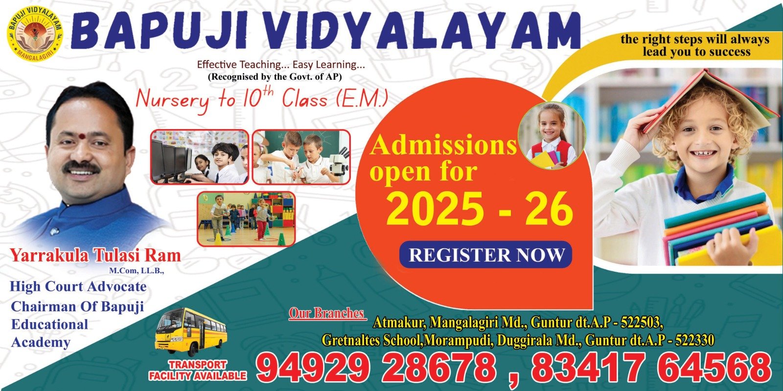 Bapuji Vidyalayam has been a beacon of educational excellence in Atmakuru Mangalagiri since 2012. We are committed to providing quality education that nurtures young minds and develops character.